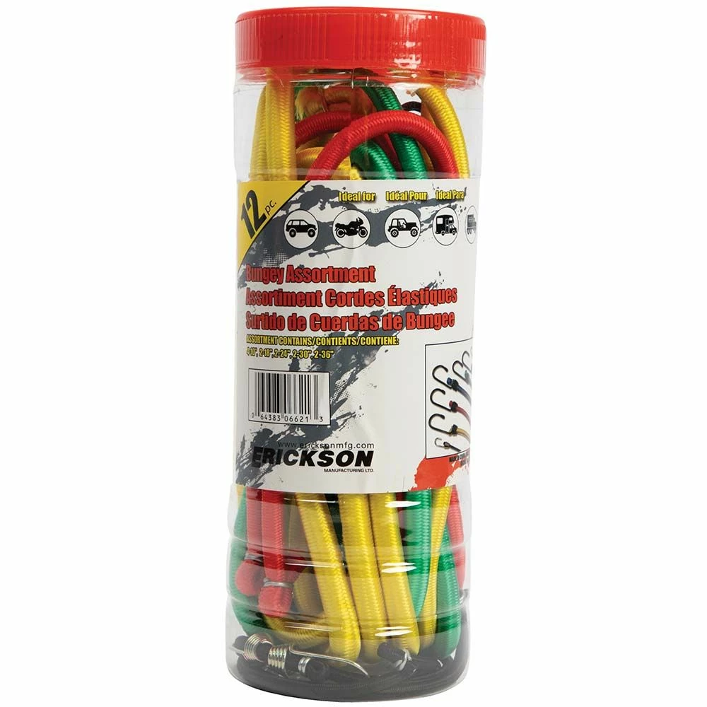 12 Ct. Erickson Assortment Bungee Jar has assorted sizes(10, 18, 24 & 30 in. cords)of bungee that have hardened wire vinyl coated hooks and comes with a reusable storage jar.