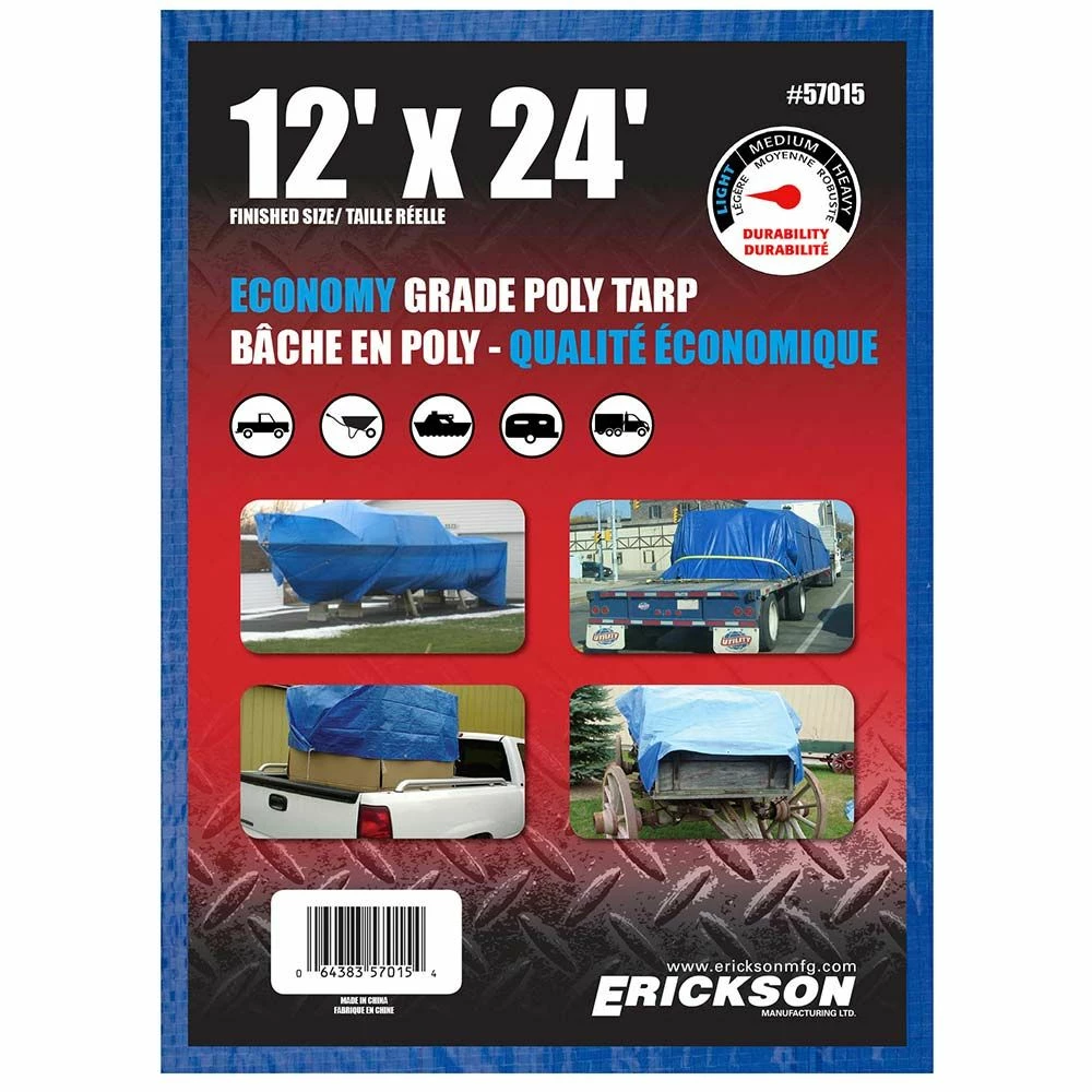 Erickson All Purpose Blue Economy Grade Tarp is designed to be a short-term or one-time use tarp. This light duty tarp is ideal to cover the load in the back of your pick-up truck, for picnics and camping, boating and many more uses! This tarp has increased UV content for longer life, rust resistant grommets and is lightweight and flexible for easy storage. There are aluminum grommets every 3 feet and at reinforced corners. Size are cut size dimensions.