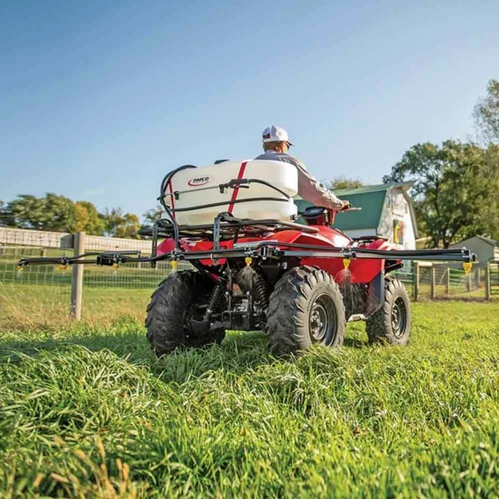 The FIMCO 25 Gallon 7 Nozzle ATV Sprayer provides precise liquid application from our folding 7 Nozzle Boom. The UV resistant, molded polymer tank has a 5 inch tethered lid for easy access and is completely drainable. Convert from a Spot to ATV sprayer with the quick release mounting bracket, allowing for simple installation or removal of the spray boom. This model features the High Flo High Performance 2.4 GPM Pump. The Lever Handgun distributes up to 30 feet of horizontal spray, 16 feet of vertical spray and comes with 15 feet of 3/8 inch hose. The 7 Nozzle boom offers 12 feet of total spray coverage and our FIMCO exclusive manifold places pressure control and boom operation at your fingertips to conveniently fine tune your spray pattern. This sprayer offers the versatility and efficiency needed to spray tight spaces or larger areas.