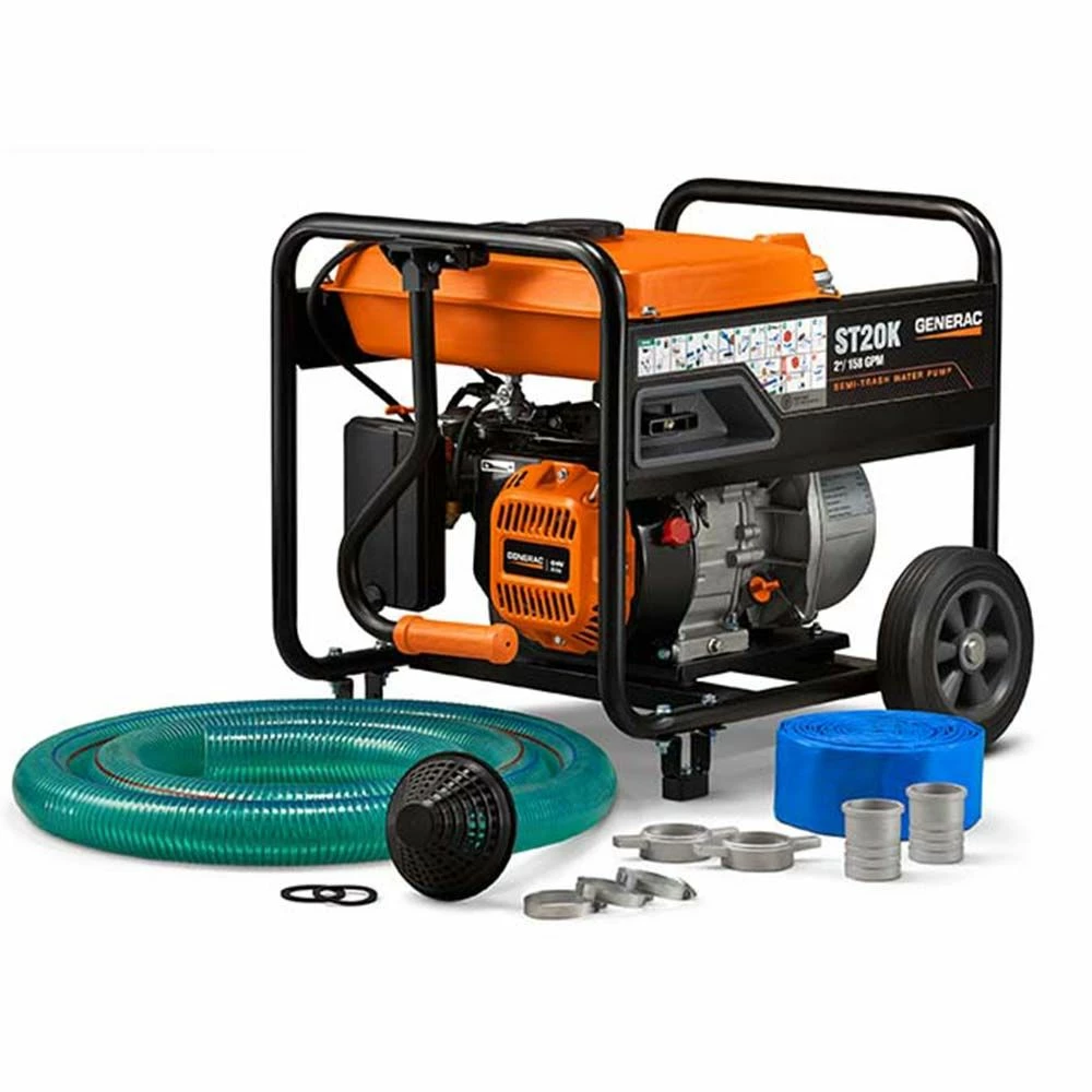 Generac Semi-Trash Water Pump 2 in. features an Easy Prime™ funnel design for quick and easy priming and a hose kit which contains a 12 ft. suction hose, 25 ft. discharge hose strainers & connectors. The powerful Generac pump can pump up to 158 gallons per minute. The suction and discharge ports are color coded to ensure the correct hose connections. This pump is designed durable with silicon carbide seal and a cast iron volute and impeller. The Generac's 208CC OHV engine with a splash of lubrication provides a long engine life. The low-oil shutdown automatically safeguards the engine from damage.