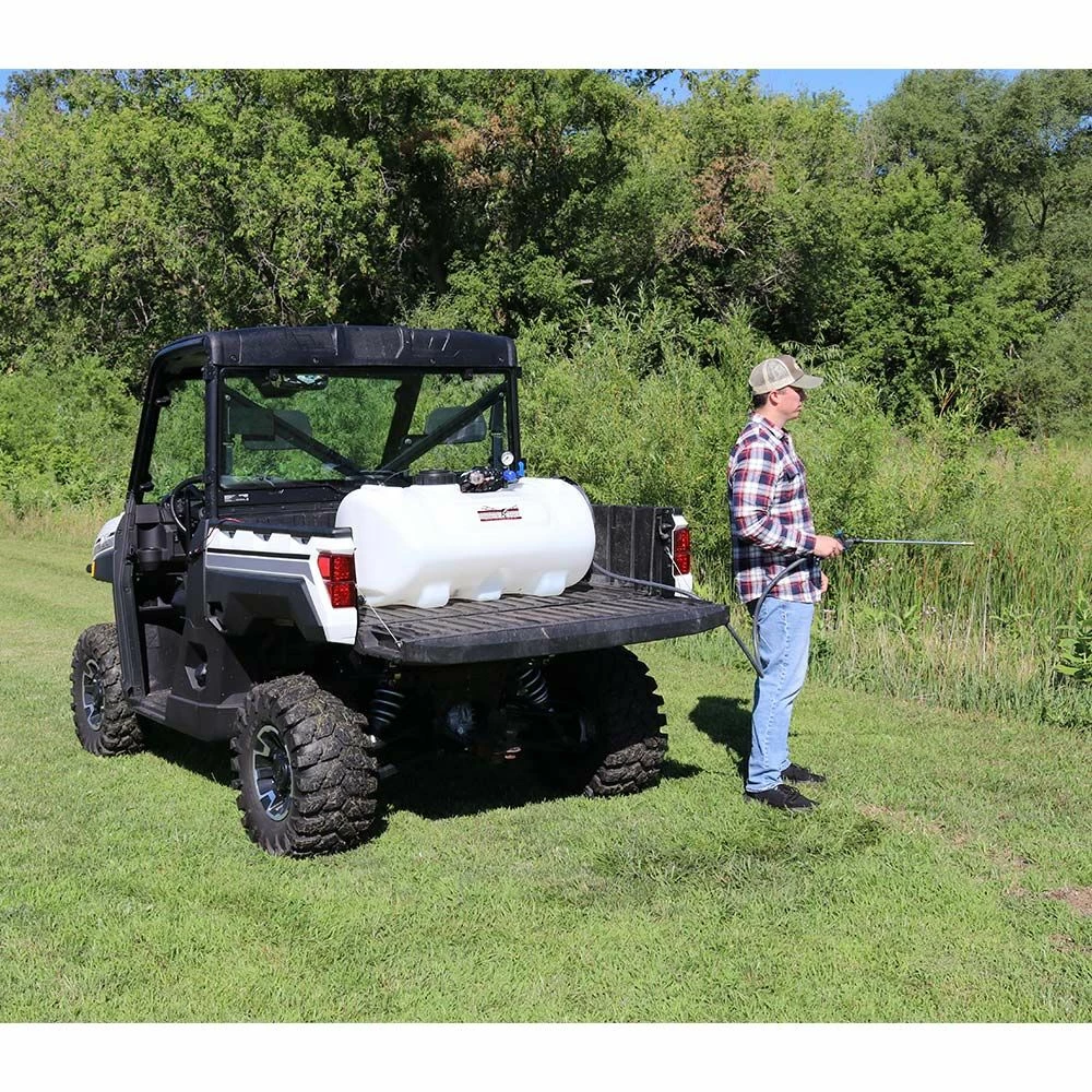 Be a sharpshooter with this Country Tuff® 40 Gallon Premium Spot Sprayer. Featuring a robust Everflo 3.0GPM 12V on-demand diaphragm pump. Keep debris and chemical clumps from entering your pump with the easy to maintain quick attach inline strainer. Keep your hose organized with the hook and loop hose strap that prevents any unwanted damage or dragging. Includes 15 feet of hose to spray gun that gives more flexibility for those hard-to-reach areas. After application use, drain remaining water and chemical with the accessible molded in drain port. Comes standard with 12v wire harness that features on/off switch and alligator clamp connection. UV resistant tank. Approved for use with Round-Up® and other agricultural brand herbicides and insecticides. Backed by a two-year warranty on pump & components. Can be used with UTVs and other means of transportation with some modifications.<br><br>Spot Spraying: When it comes time to spot spray, un-holster your deluxe spray gun and reach up to 25 feet vertically and 30 feet horizontally from the comfort of your seat. As applications change, quickly adjust the heavy-duty brass nozzle from a steady stream to a wide mist. Deluxe spray gun is field repairable and features a trigger lock to reduce hand fatigue on longer jobs.<br><br>Broadcast Spraying: This premium spot sprayer is already broadcast spray boom ready with the included adjustable pressure regulator, pressure gauge and boom shut-off valve that controls flow to broadcast spray boom. Universal setup for a wide range of manufactured broadcast spray booms. Broadcast spray boom sold separately. Coverage: This spot sprayer is designed to handle high volume isolated spraying applications. Easily tackle weeds, trees, fence lines, livestock, and similar applications.#html-body [data-pb-style="6216044B4093E"]{justify-content: flex-start; display: flex; flex-direction: column; background-position: left top; background-size: cover; background-repeat: no-repeat; background-attachment: scroll; border-style: none; border-width: 1px; border-radius: 0px; margin: 0px 0px 10px; padding: 10px;}#html-body [data-pb-style="6216044B4095F"]{border-style: none; border-width: 1px; border-radius: 0px; margin: 0px; padding: 0px;}